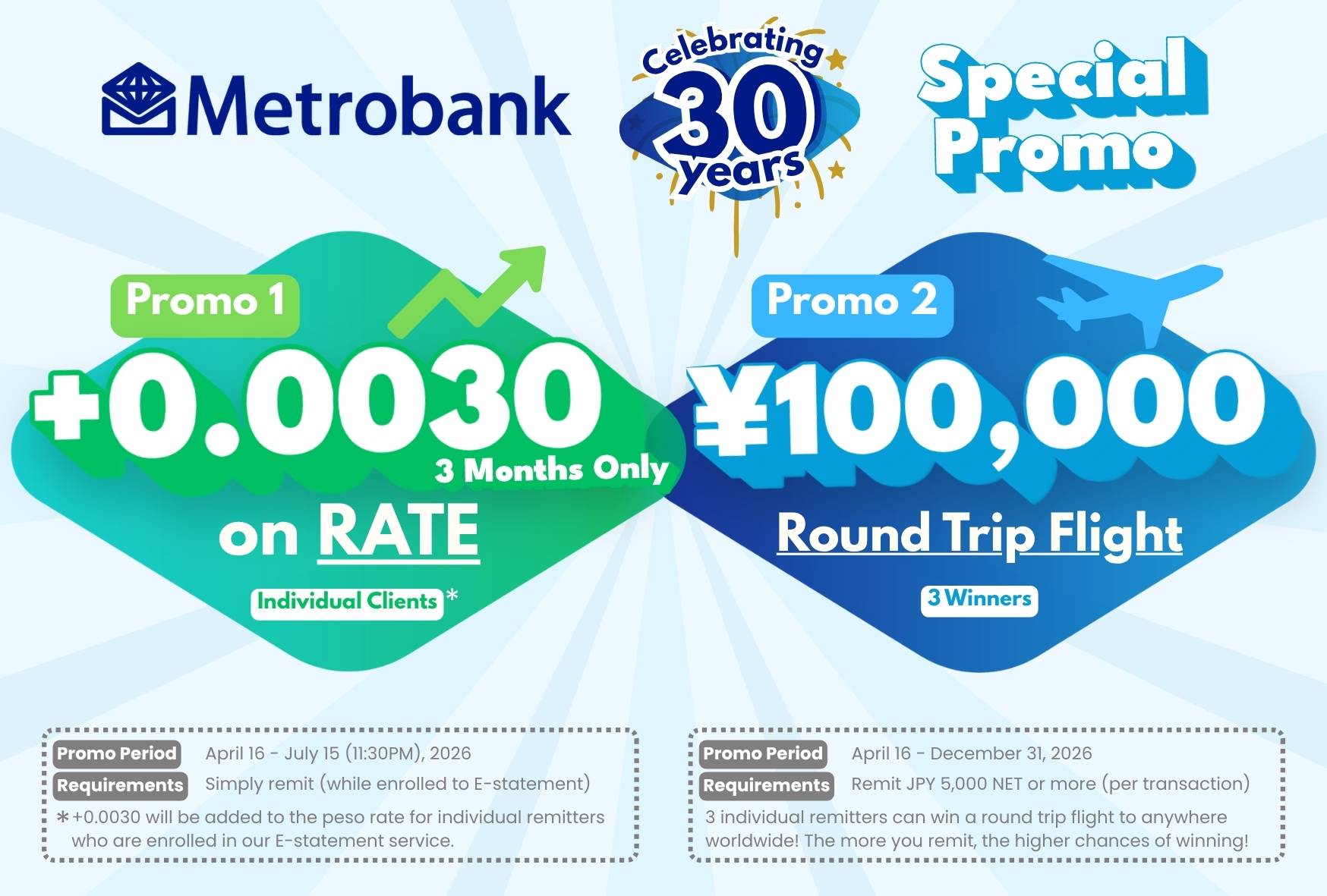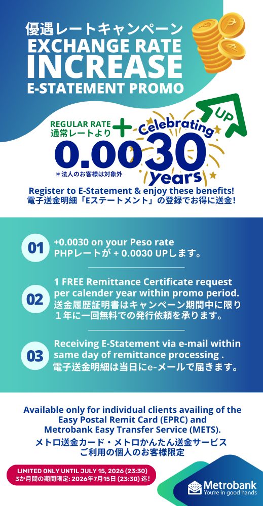Celebrating our 30 years of service with higher rates! Enjoy +0.0030 on your yen to peso rates for all your remittances to the Philippines during the promo period.